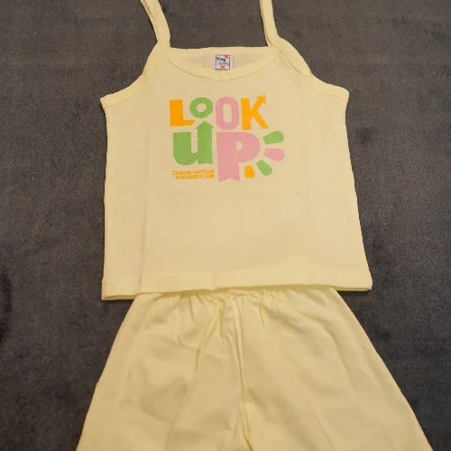 The sleeveless top features a vibrant “Look Up” graphic print that adds a playful and positive vibe. The matching skirt offers a relaxed fit, allowing easy movement for active kids. The lightweight fabric ensures proper airflow, making it ideal for summer outings, casual wear, and daily comfort.