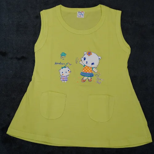 Soft cotton sleeveless frock for baby girls featuring adorable cartoon prints and dual front pockets. Available in vibrant lime green, sky blue, and orange shades. Comfortable, breathable, and perfect for daily wear.