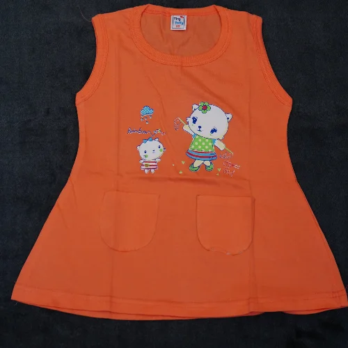 Each frock features a cute cartoon character print on the front, adding a playful and charming touch. The dual front pockets not only enhance the look but also add a practical element. The sleeveless design allows easy movement, making it ideal for playtime, outings, and casual wear.